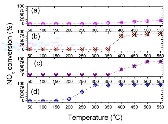 The catalysts are screened for the CO-SCR reaction to find out the optimum conditions for maximum NOx conversions. In all cases, the amounts of the catalysts are 150 mg and the total flow of NOx, CO, and He is 80 mL·min−1 with the variations in reaction temperatures from 50 to 500 °C (Figure 7).