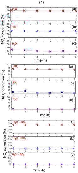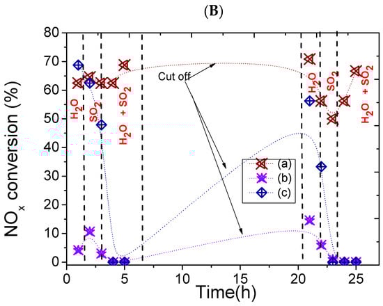 Further experiments with the addition of 50 ppm of SO2 are carried out, as shown in Figure 8A. As one can see, the SO2 inlet declines more the catalytic performance of the solids compared to just the H2O inlet, especially for NiMo and PtMo catalysts. Sulfur is considered to be a poison for catalytic reactions as it strongly interacts with both acid and metallic active sites of a catalyst that allows the deactivation of the catalysts [43]. The favorable adsorption of the sulfur species bound to the MeMo or Nb surface may lead to a blocking of the catalyst’s surface and pores and, thus, the coexistence of SO2, CO, and NOx deactivate the catalyst. Similarly, PtMo sites are deactivated by SO2 addition due to the sulfur bound to Pt sites giving sulfided phases, which produce a diminution in the availability of active sites, being Pt sites less effective to activate the hydrocarbons during HDS reactions [43,44].