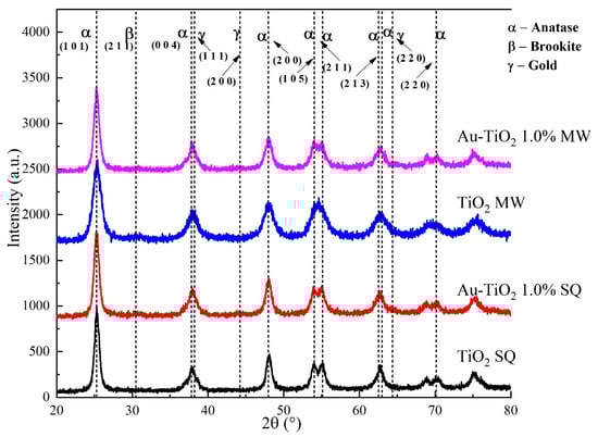 XRD analysis was carried out to determine the crystal phases and crystallite size of Au-TiO2 photocatalysts synthesized by the MW and SQ methods. Figure 2 shows a comparison of the XRD patterns obtained in each case.