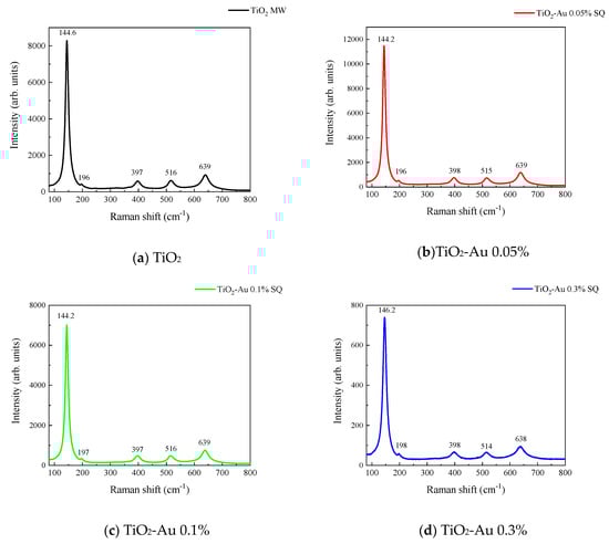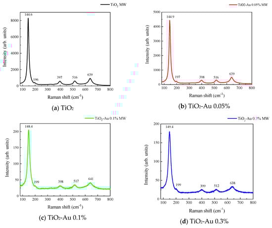 Figure 3 and Figure 4 show the Raman spectra of the Au-TiO2 samples synthesized by the MW and SQ methods, respectively. All spectra are characterized by Raman peaks around 144, 197, 399, 515, and 639 cm−1 which correspond unambiguously to the anatase phase of TiO2 [,,]. The three bands at 147, 197, and 639 cm−1 are assigned to the Eg modes and the band at 399 cm−1 to the B1g mode. The band at 515 cm−1 is a doublet of the A1g and B1g modes []. From these spectra it is clear that no matter the synthesis method only the anatase phase is obtained.