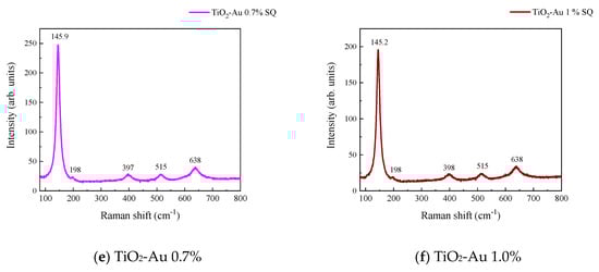 Raman spectra recorded for Au-TiO2 samples synthesized by the SQ Method (a) TiO2, (b) TiO2-Au 0.05%, (c) TiO2-Au 0.1%, (d) TiO2-Au 0.3%, (e) TiO2-Au 0.7%, (f) TiO2-Au 1.0%.