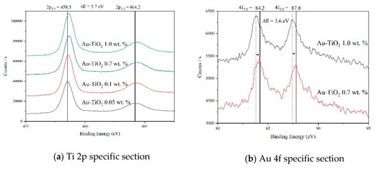 Also, no formation of Ti3+ was detected in the present synthesis []. In Figure 6b, the XPS high resolution spectra corresponding to the 4f gold region are presented. The doublet at 84.2 and 87.7 eV corresponds to the 4f7/2 and the 4f5/2 gold core level with a binding energy difference of 3.6 eV [,,], it is important to notice that below 0.3 wt.% of Au load, gold was not detected. Also, a shift of these peaks towards lower energies, as the gold load increases is observed indicating negative charges on the surface of TiO2 [,].