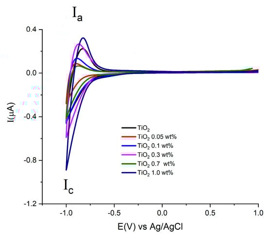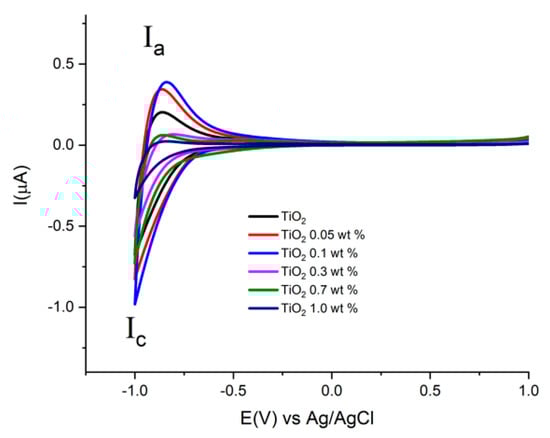 Figure 7 shows cyclic voltammograms acquired at a scan rate of 0.1 Vs−1, using the prepared electrodes with Au-TiO2 synthesized by the SQ method in the presence of 0.1 M NaOH (pH 12.9). In the complete scan one reduction (Ic) signal and one oxidation (Ia) signal are observed, attributed respectively to the reduction and oxidation of Ti(IV) sites in the TiO2 and the conduction-band filling accompanied by proton insertion [,]. This process at the surface of TiO2 is described by the following chemical Equation (1):