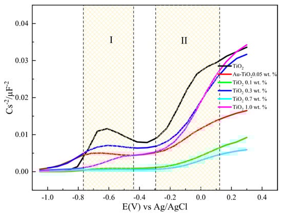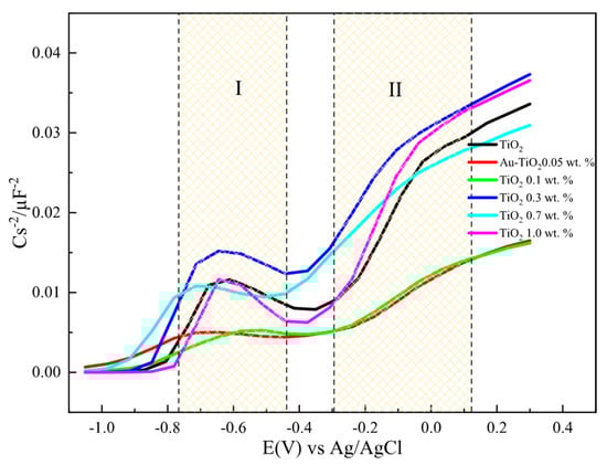 Figure 10 shows Mott-Schottky plots for electrodes with Au-TiO2 synthesized by the SQ method. Two regions (labeled as I and II) can be observed where the different density of donors, Nd, and flat-band potentials (Efb) can be calculated. This behavior is consistent with a typical hetero-phase junction of anatase and brookite with oxygen vacancies [,]. According to that Nd and Efb for the mixture is calculated and presented in Table 3.