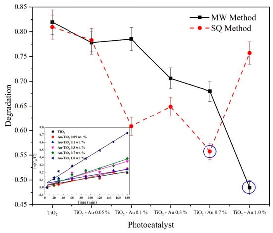 In the inset graph, a pseudo-first-order kinetic model fit for the MW photocatalysts is shown. For all the synthesized samples a good linear fit was achieved, with rate constants (k1) varying from 1.03 × 10−3 min−1 for undoped TiO2 to 3.79 × 10−3 min−1 for Au-TiO2 1.0 wt.% for the MW method samples and rate constants varying from 1.01 × 10−3 min−1 for undoped TiO2 to 3.13 × 10−3 min−1 for Au-TiO2 0.7 wt.% for the SQ method samples. It can be observed that similar values of kinetic constants were achieved for undoped TiO2 for both the MW and the SQ method, however, there is a clear difference in the degradation performance as the Au load increases. It is important to notice that to obtain the best performance using the SQ method it was necessary a smaller amount of dopant, being the optimal dopant load 0.7 wt.% while for the MW method the optimal load of gold was 1.0 wt.%.