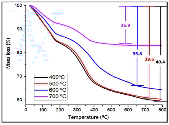 Thermogravimetric analysis (TGA) of NiFe (0:1) mixed oxides is presented in Figure 1. It can be seen that oxides calcined at temperatures below 700 °C showed losses above 35%, indicating that nitrate and glycine residues were still present. For the solid calcined at 700 °C, the loss was only 17%, which basically corresponds to water [34].