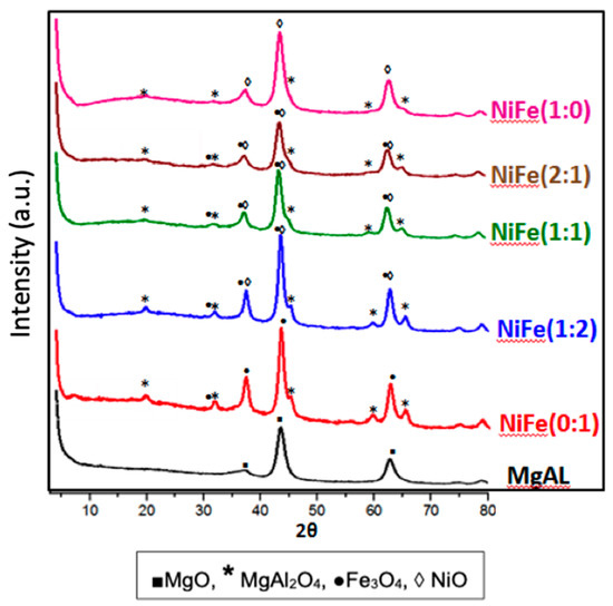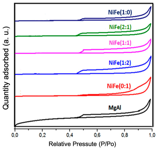 The adsorption isotherms of the mixed NiFe/MgAl oxides are shown in Figure 3. All the oxides showed type IV isotherms (IUPAC classification) corresponding to mainly mesoporous materials with H3 type hysteresis loops [37,38]. It is evident that the nature of metal of the active phase did not have an important effect on the area of the synthesized solids as all the oxides had areas close to 80 m2 g−1 and a pore volume of 0.120–0.180 cm3 g−1 (Table 1). However, the MgAl support was characterized by a high specific surface area and a large pore volume (0.286 cm3 g−1). It was reduced with the introduction of Ni and Fe metals. This was probably due to the blockage in the MgAl phase, which reduced the surface area of the final material due to the presence of very small NiO and Fe2O3 particles (2–4 nm) (Table 1).