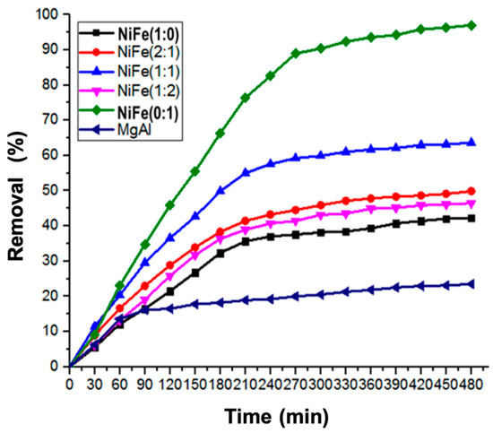 The catalytic activity at 25 °C was evaluated in the wet air oxidation of CV as mentioned above and chosen as a representative model molecule of recalcitrant dyes. Figure 5 shows the catalytic behavior of mixed oxides (NiFe/MgAl). It can be seen that the solid with only Fe as the active phase showed the best results (100% of elimination in 8 h of reaction).