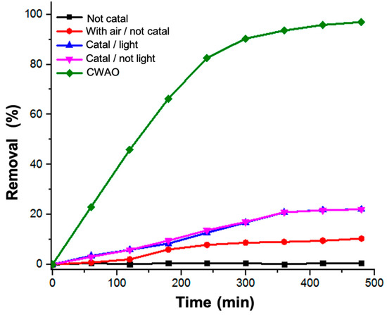 The vast majority of dyes are photosensitive, which means they are unstable in the presence of light, thereby enabling their degradation in its presence. In Figure 7, it can be observed that regardless of the presence or absence of light (catal/light or catal/no light respectively), the CV was very stable and was not affected, with identical results for the two tests. This demonstrates that it is not a photocatalytic process and that the degradation was mainly governed by a CWAO process.
