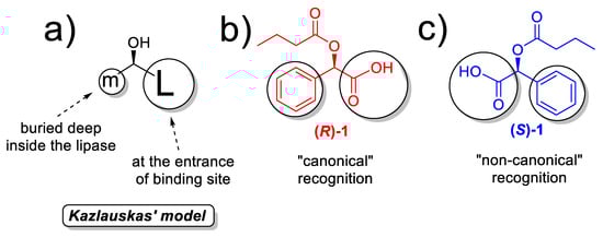 - Kazlauskas, R.J.; Weissfloch, A.N.E.; Rappaport, A.T.; Cuccia, L.A. A rule to predict which enantiomer of a secondary alcohol reacts faster in reactions catalysed by cholesterol esterase, lipase from Pseudomonas cepacia, and lipase from Candida rugosa. J. Org. Chem. 1991, 56, 2656–2665. [Google Scholar] [CrossRef]