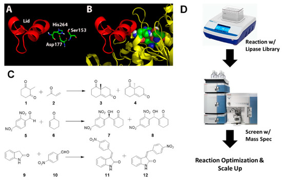 Porcine pancreatic lipase (PPL) is a model lipase for biocatalysis of C-C bond forming reactions. The active site ((A) colored spheres) of PPL is presumed to catalyze the C-C bond forming reactions via carbonyl binding and activation in an oxy-anion hole. The lid domain ((A) red ribbon) is presumed to undergo interfacial activation (assuming an open conformation in more hydrophobic solvents). (B) Both lid domain and active shown in context of 3D protein ribbon structure (PDB ID 1ETH). (C) Examples of carbon-carbon bond forming reactions catalyzed by lipases (Robinson annulation: reaction of cyclohexanedione 1 and methyl vinyl ketone 2 provides bicyclic Wieland–Miescher ketone products 3 and 4; Morita–Baylis–Hillman: reaction of dinitrobenzaldehyde 5 and cyclohexenone 6 provides MBH products 7 and 8; and Knoevenagel condensation: reaction of 2-oxindole 9 and nitrobenzaldehyde 10 provides KC products 11 and 12). (D) Overview of screening methodology. Biocatalytic reactions were scaled down but otherwise conducted according to literature procedures. Mass spectrometry methodologies (LC/MS and MALDI) were used to screen the resulting biocatalytic reactions for product formation. Commercially available compounds were purchased for use as standards in mass spec calibration. Screening was then followed by reaction optimization and measurement of yield and stereoselectivity.