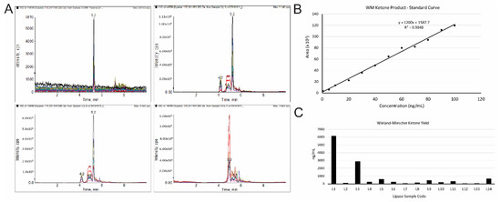 We began by assembling a 14-member library of commercially available lipases preparations, selecting lipases previously reported to catalyze C-C bond forming reactions (porcine pancreatic lipase, Candida antarctica lipase B) [11,12,14,17], in addition to lipase preparations with unknown biocatalytic properties in promiscuous biocatalysis (Wheat germ lipase). Biocatalytic potential of the lipase library was then assessed for synthesis of the Wieland–Miescher ketone from methyl vinyl ketone and 2-methyl-1,3-cyclohexanedione using recently reported literature conditions [12]. To rapidly assess biocatalytic potential of the library, an LC/MS method was developed (Materials and Methods) that detected only the main fragmentation pattern Wieland–Miescher ketone product (Figure 2).