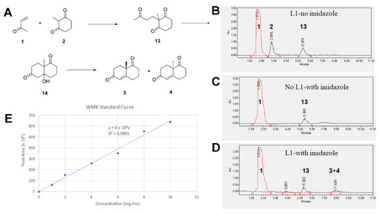 Investigation of reaction products in the presence and absence of imidazole and lipase preparation. (A) Starting materials 2-methyl-1,3-cyclohexanedione 1 and methyl vinyl ketone 2 produce triketone intermediate 13, which proceeds through bicyclic species 14 to WMK products 3 and 4. (B) HPLC chromatogram of reaction sample with L1 but no imidazole. (C) HPLC chromatogram of reaction sample with imidazole but no L1. (D) HPLC chromatogram of reaction sample with both L1 and imidazole. (E) Standard curve generated using HPLC data obtained from commercially available Wieland–Miescher ketone. Reaction conditions taken from [18].