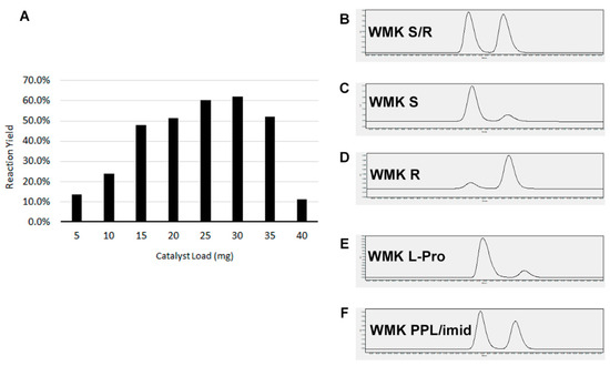 Effect of catalyst loading on reaction yield and determination of enantiomeric excess in L-Proline and PPL/imidazole catalyzed WMK reactions. (A) PPL/imidazole reactions in DMSO with varying amounts of PPL catalyst. Chiral HPLC chromatograms (Chiralcel OD-H column; mobile phase: isopropanol/heptane mixture (20/80, v/v) containing 0.1% formic acid) are shown for: (B) racemic WMK standard; (C) S-WMK enriched standard; (D) R-WMK enriched standard; (E) purified L-proline catalyzed WMK product; and (F) purified PPL/imidazole catalyzed WMK product.