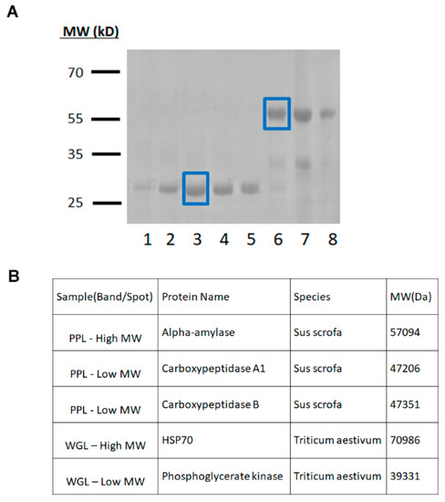 Previous reports have demonstrated the presence of multiple biocatalytic entities present in commonly used lipase preparations [19]. Having optimized our reaction conditions with crude lipase preparations, we sought to more precisely define their composition. We separated the crude PPL mixture on a size exclusion column, isolating two primary components (Figure 5A). Bands were excised and subjected to proteolytic digest and subsequent characterization by mass spectrometry (see Section 4). The higher molecular weight species was identified as porcine alpha-amylase, whereas the lower molecular weight species was identified as a porcine carboxypeptidase (both carboxypeptidases A1 and B were present in the analysis). Surprisingly, neither of the principle components of this commonly used lipase preparation was porcine pancreatic lipase. This is significant, since numerous reports use this preparation of porcine pancreatic lipase (Type II), and others without further purification [12,14,20,21]. A second lipase from our library with biocatalytic activity for WMK production (L3; wheat germ lipase) was also characterized by this method (Figure 5B and Supplementary Materials Figure S1). Again, none of the principle components of this preparation was identified as wheat germ lipase.