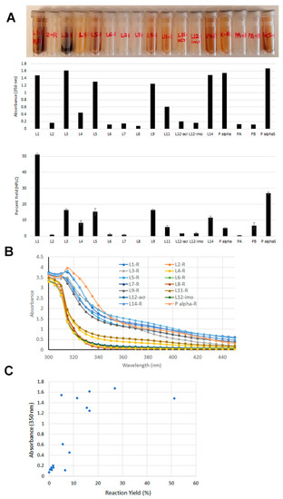 Rescreening of the lipase library under optimized conditions. (A) Images of reactions after 89 h (top); absorbance of crude reaction mixtures at 350 nm (middle); and reaction yields from rescreening of each the lipase library (bottom). Error bars determined from three replicate HPLC injections. (B) Wavelength scan of crude reaction absorbance. (C) Plot of absorbance (350 nm) versus reaction yield.