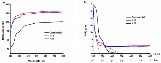 (a) UV-visible diffuse reflectance spectra and (b) Kubelka–Munk plots of the SrCO3 synthesized at Sr:EtOH mole ratios of 1:18 and 1:23, compared with those of commercial SrCO3.