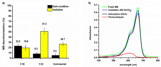 The percentage of MB colour removal after treatment with SrCO3 photocatalyst (sample 1:23) is shown in Figure 7a. When a suspension of SrCO3 in 10 ppm fresh MB solution was kept in the dark for 3 h, the concentration of dye slightly decreased, while the colour of the dye solution remained unchanged. It was observed that the absorption capacity of MB on the SrCO3 surface is negligible because the specific area of the prepared SrCO3 photocatalyst is low (9.23 m2·g−1). Upon visible irradiation, the prepared SrCO3 gave a high percentage of MB colour removal (>99% after 3 h visible irradiation).