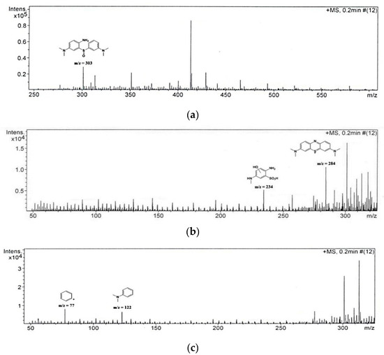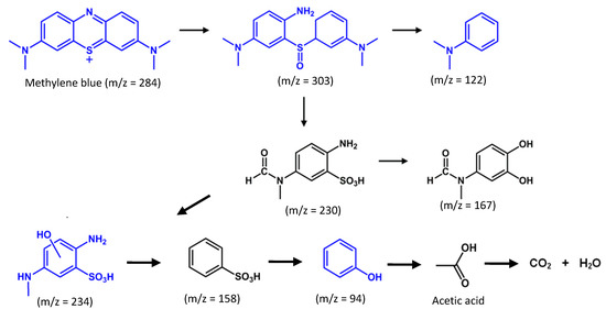 Figure 10 highlights mass spectra generated from the MB degradation products with the mass-to-charge ratios (m/z) of 77, 122, 234, 284 and 303, reported with the possible fragmented ions shown accordingly.