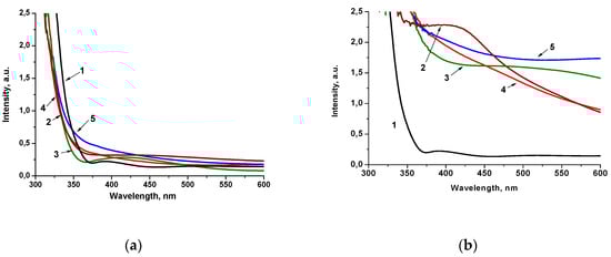 Absorption spectra of 1 mol.% Pt-doped films prepared by Method 1 (a) and Method 2 (b): (1) TiO2; (2) Pt-TiO2; (3) Pt-TiO2UV; (4) Pt,N-TiO2; (5) Pt,N-TiO2UV.