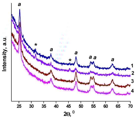 XRD patterns of the films (a-anatase): (1) 1Pt-TiO2M1; (2) 1Pt,N-TiO2M1; (3) 1Pt-TiO2M2; (4) 1Pt,N-TiO2M2.