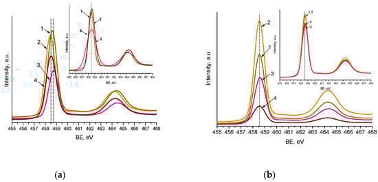 Ti2p XPS spectra of the films synthesized by Method 1 (a) and Method 2 (b) contained 1 mol.% Pt and 0.5 mol.% Pt (insert): Pt-TiO2 (1), Pt,N-TiO2 (2), Pt-TiO2UV (3), Pt,N-TiO2UV (4).
