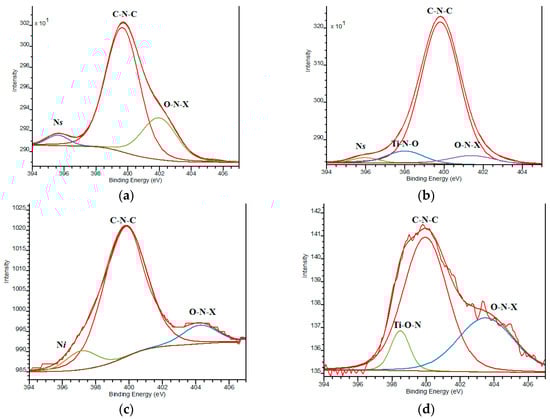 XPS N1s deconvoluted lines: (a) 1Pt,N-TiO2M1; (b) 1Pt,N-TiO2M2; (c) 1Pt,N-TiO2M1UV; (d) 1Pt,N-TiO2M2UV.