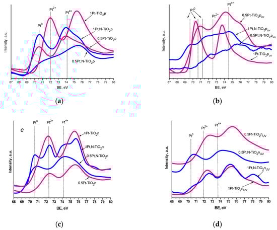 The positions of Pt4f7/2 ascribed to PtO and PtO2 are stated at 72.4 and 74.9 eV, respectively. The deviations of the Pt4f7/2 BE values from the standard ones are observed in our case. The maxima of deconvoluted Pt4f7/2 lines at 71.1–72.1 eV and 74.2–74.6 eV are ascribed to Pt2+ and Pt4+ ions surrounded by Ti as a less electronegative element than Pt in PtO and PtO2 structures, respectively, suggesting the most probable formed fragments are Pt-O-Ti. BE values at 72.3–72.5 eV are assigned to the formation of Pt-O-Pt bonds with the +2 oxidation state of Pt.