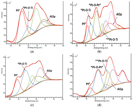 The XPS spectra of Pt4f lines exhibit complex non-symmetric shaped curves, indicating the presence of various Pt oxidation states (Figure 6 and Table 4). A spin-orbit coupling is established according to the position of the energy of deconvoluted Pt4f lines, in the range of 3.3–3.4 eV (Table S1), with the intensity ratio of Pt4f7/2:Pt4f5/2 = 4:3. Since the area of the Pt4f5/2 region exceeded the Pt4f7/2 one, the deconvolution was performed considering the overlapped peak of Al2p (BE values of Al3+ are situated at 74.6–75.6 eV) [51] (Figure 7). The presence of Al3+ ions can be explained by the traces of this element from the reagents used in the synthesis procedure.