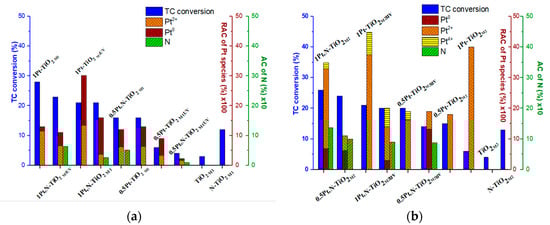 Comparing the photocatalytic activity of Method 1 materials (Figure 10a), one can note that the films synthesized using 1 mol.% Pt(acac)2 exhibit a higher conversion of TC molecules. It is also obvious that RACs of Pt species affect the photoperformance of the photocatalysts: the higher the RAC of Pt0 is, the lower the TC conversion that occurs. In cases of a low RAC of Pt2+, the presence of nitrogen seems to be crucial for an increased activity. The low photoactivity of 0.5Pt-TiO2M1UV and 0.5Pt,N-TiO2M1UV is explained by the lowest atomic contents of the doping agents among tested materials. As seen from Figure 10a, the presence of urea and UV pretreatment affects the relative atomic content of Pt0 NPs [46]. Hence, the activity of Pt-containing films of Method 1 can be caused by some mutual parameters: efficient incorporation of Pt2+ in the TiO2 lattice, the low content of Pt0 and doping by nitrogen.
