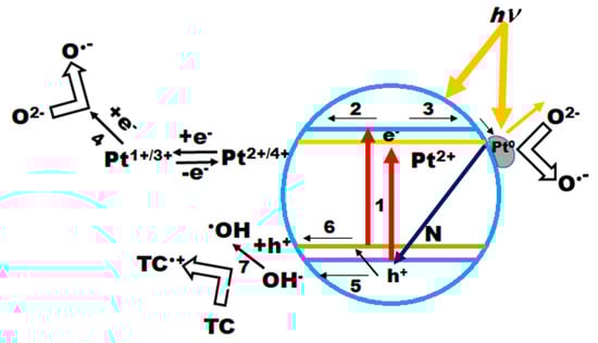 After light absorption with energy lower (the lines in the spectrum of the used lamp with a cut-off filter shown in Figure S1 are 364, 404 and 434 nm corresponding to 3.4, 3.1 and 2.9 eV, respectively) than the bandgap energy of titania (step 1), the transition of an electron from the valence band to the sublevel of Pt or from the N sublevel to the conduction band can occur. It appears that Pt ions play the role of trapping centers for photogenerated electrons, with a following reduction in oxygen molecules to superoxide radicals, and Pt oxidation to its previous oxidation state (steps 2 and 4) [25]. As shown by the experimental results, the higher content of Pt0 has a detrimental effect on photocatalytic processes, suggesting their light screening from the TiO2 surface or preferential charge recombination, as proposed in [27]. The oxidation pathways are strongly dependent on the trapping efficiency of photoformed electrons and a consequence can be the direct interaction of h+ with surface OH groups or via the trapping by N species, in the case of N-containing materials (steps 5 and 6). The resulting OH radical oxidizes the TC molecule (step 7). It is most probable that the nitrogen species are able to prevent the charge recombination by trapping a hole, which is confirmed by the high photoreactivity of the nitrogen-doped films of Method 2. Thus, the design of materials with controlled oxidation states of Pt and N in TiO2 is a prospective strategy to drive the development of solar photocatalysts.