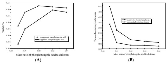 Compared to unsupported PTA under different catalyst dosage conditions, the LWCS obtained by the supported PTA catalyst had a higher yield and lower average molecular weight, which indicated that supported PTA could significantly improve the degradation efficiency of chitosan (Figure 1A,B).