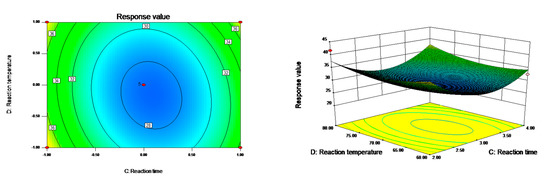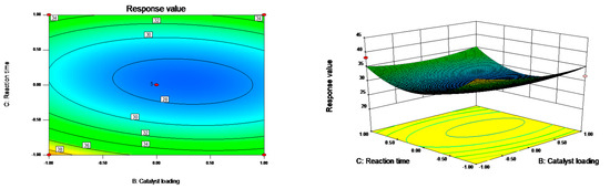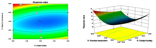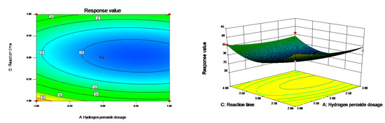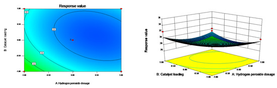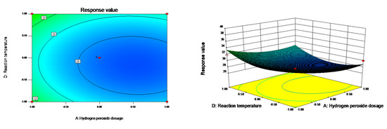 The shape of the contour was an ellipse, which indicates the interaction of factors. However, the circular shape indicated that the interaction was not significant [13]. It can also be seen from Figure 2, Figure 3, Figure 4, Figure 5, Figure 6, Figure 7 that the interactions between reaction temperature and time were significant. The interactions between reaction temperature and hydrogen peroxide dosage, catalyst loading and time on hydrogen peroxide dosage and catalyst loading were not significant.