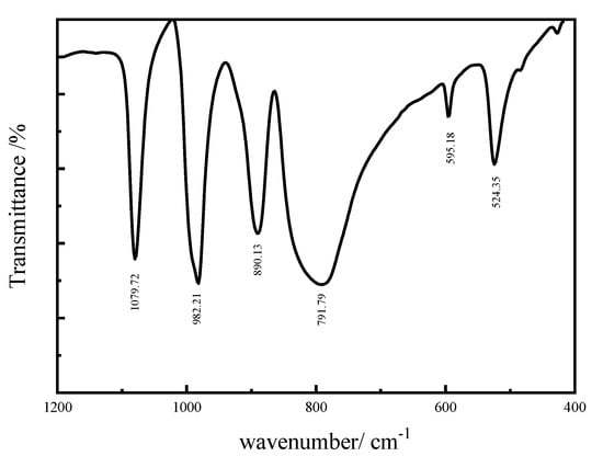 The FTIR spectra of supported PTA catalysts are presented in Figure 8. There were several characteristic absorption peaks of Keggin structure at 500–1100 cm−1 of supported PTA. Its characteristic bands were at 1079.72 cm−1 (P–Oa stretching), 982.21 cm−1 (W=Ot stretching), 890.13 cm−1 (W–Ob stretching), 791.79 cm−1 (W–Oa stretching), 595.18 cm−1 and 524.35 cm−1 (W–Oc stretching), indicating that the Keggin structure of PTA was maintained when it was loaded by activated carbon.