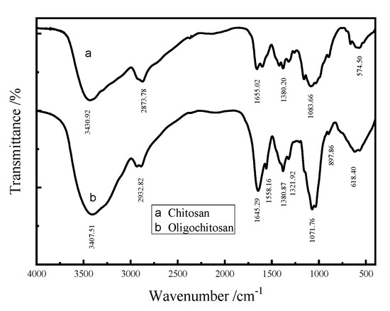 The FT-IR spectrum of Figure 9 shows that the functional group positions of raw chitosan and LWCS had not changed, but the absorption strengths were different. The stretching vibration of ether bond in the pyran ring caused a peak at 1071.76 cm−1, while the characteristic absorption peak of the beta-pyran glycoside bond was at 897.86 cm−1. The peaks at 3250–3500 cm−1 were related to the stretching vibration of –NH and –OH; the peaks at 2800–3000 cm−1 were ascribed to the stretching vibration of –CH, stretching vibration of –CH2 and stretching vibration of –CH3. In addition, there was no absorption peak at 1645–2000 cm−1, indicating that the reaction was carried out by disconnecting the beta–(1,4)–glycoside bond, without carbonyl and carboxyl groups. The above results verified that the molecular structure of chitosan had not changed before and after degradation, and only the molecular weight had been reduced.