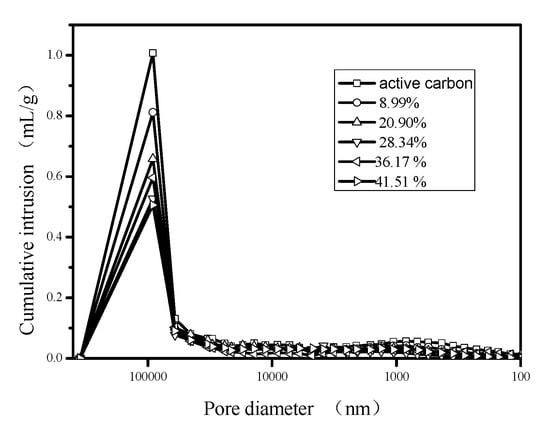 The cumulative intrusion vs. the pore diameter of active carbon under different loading.
