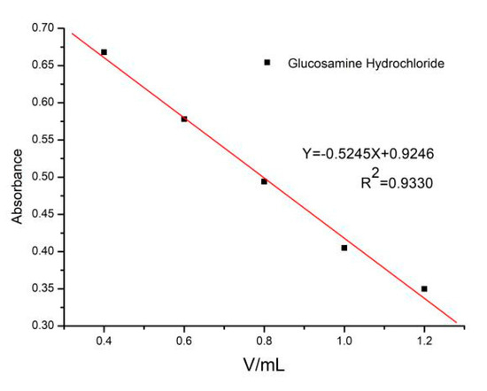 The average molecular weight of chitosan was determined by end-group analysis. A certain concentration of glucosamine hydrochloride was used as the standard solution. The absorbance of the standard solution was measured at 420 nm wavelength, and the standard curve was drawn as shown in Figure 11. Then, a certain concentration of chitosan solution was prepared, and the absorbance of chitosan was determined by repeating the steps mentioned above. The volume of the reference solution corresponding to the absorbance of the product chitosan solution was determined by the standard curve. The average molecular weight of chitosan was calculated according to the following formula.