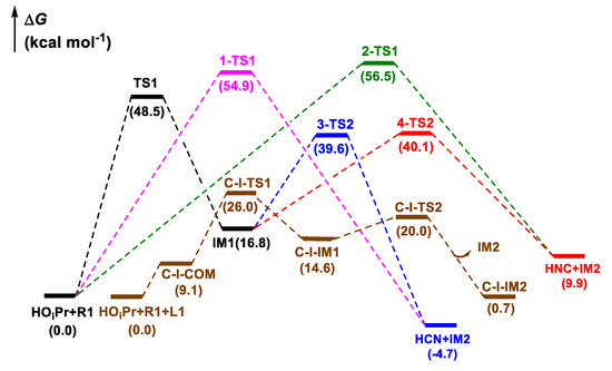 For comparison, the formation of HNC assisted by cinchona alkaloid (L1) was studied (Figure 1 and Figure 2). In the initial complex (C-I-COM), the cinchona alkaloid activated HOiPr by the N atom of the tertiary amine ring and OH group simultaneously with (O)H···O and N···H distances of 1.858 and 1.834 Å, respectively. These hydrogen bonds could be verified by atoms-in-molecules (AIM) analysis, with the positive Laplacian (∇2ρ) on (3, −1) bond critical points (BCPs) (Figure S1). In the next step, the O atom of HOiPr approached the C atom of CNCOOEt, accompanied with H transfer from the O atom to N atom via C-I-TS1. Then, HNC was formed by breaking the C-C bond via C-I-TS2, with a ΔG of 20.0 kcal mol−1. From the viewpoint of energy, cinchona alkaloid could promote the transformation of CNCOOEt to HNC by organocatalysis.