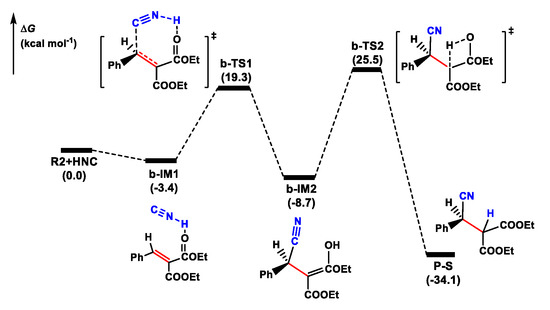 The isomerization between HCN and HNC can occur quickly in the presence of cinchona alkaloid [29], establishing rapid HCN–HNC equilibrium. Then, HNC can act as an active cyanide species to construct a C-C bond by interacting with an olefin in the cyanation reaction. Based on these results, we first studied the mechanism of the noncatalytic cyanation of olefins with HNC (Figure 3). The reaction occurred through a two-step process: C-C bond formation followed by C-H bond construction. In the initial step, HNC interacted with the COOEt moiety through hydrogen bonding, forming a molecular complex b-IM1. Then, the CN group attacked the olefin to form a C-C bond via a seven-membered ring transition state b-TS1. In the final step, the product P-S was formed by shifting an H atom to a C atom (tautomerization of enol to keto), with a ΔG≠ of 34.2 kcal mol−1. This H-transfer step was predicted to be the rate-determining step (RDS) in the background reaction. We also located the TS involving HCN as a proton donor (b-TS1-1, Figure S2). The relative Gibbs energy of b-TS1-1 was higher than that of b-TS2 (the highest point in the energy profile) by 8.4 kcal mol−1. These results indicated that the noncatalytic reaction was difficult to achieve owing to a higher barrier.