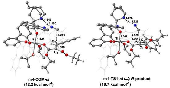Optimized structures of the monodentate Ti(IV)-complex (m-I-COM-si) and TS (m-I-TS1-si) in the C-C bond construction step in the catalytic cyanation reaction of olefin along the si-face attack pathway and their relative Gibbs free energies. The intermolecular distance is in Angstroms (Å). The color definitions of atoms are red = oxygen, blue = nitrogen, gray = carbon and white = hydrogen.