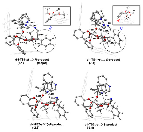Optimized geometries of TSs in the C-C bond formation step (d-I-TS1-si and d-I-TS1-re) and H-transfer step (d-I-TS2-si and d-I-TS2-re) in the cyanation reaction of olefins catalyzed by Ti(IV)-complex along two competing pathways for R- and S-configuration products, respectively, associated with the relative Gibbs free energies (kcal mol−1). The intermolecular distance is in Angstroms (Å). The color definitions of atoms are red = oxygen, blue = nitrogen, gray = carbon and white = hydrogen.