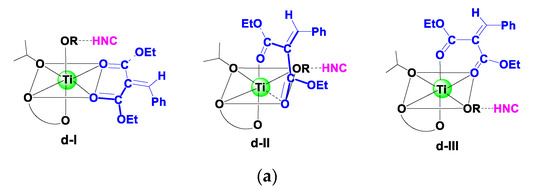 A previous study indicated that aldimine and HOiPr could coordinate to the Ti(IV), forming a reactive hexacoordinated Ti(IV)-complex in the Strecker reaction catalyzed by Ti(IV)-complex catalyst with cinchona alkaloid and achiral 3,3′-disubstituted 2,2′-biphenol ligands [29]. Based on experimental observation [28], a cinchonidine(L1)/Ti(IV)/(R)-biphenol (L2a) catalyst was employed as an active species in the reaction. Considering that there were two O-donors in the olefin substrate, a bidentate model was first studied in the present work, in which two carbonyl groups of olefin coordinated to the Ti(IV) center simultaneously, forming three possible hexacoordinated Ti(IV)-complexes (d-I–d-III). For comparison, the monocoordinated models (m-I–m-VI) were also investigated (Scheme 3). Nine low-energy Ti(IV)-complexes in mono- and bidentate models were located to allow the favorable si-face attack pathway observed in the experiment (see Table 1 and Figure S3). Table 1 shows that a bidentate Ti(IV)-complex (d-I-COM-si) had the lowest Gibbs free energy among nine models. In other words, this complex was the only starting species available in the reaction mixture.