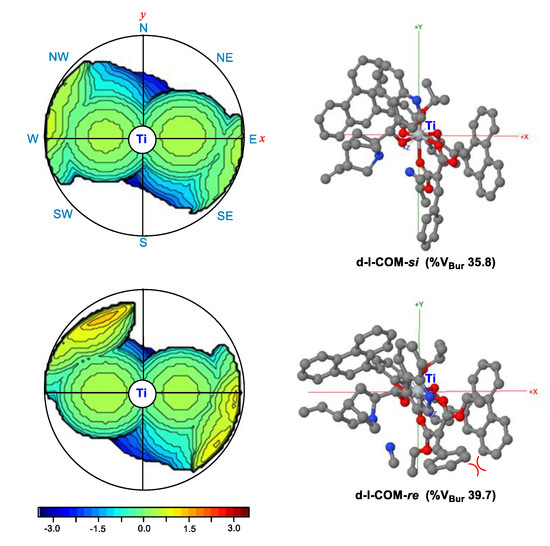 Topographic steric maps for d-I-COM-si and d-I-COM-re. %VBur is the percentage of buried volume, obtained by SambVca 2.1 software [45,46,47].