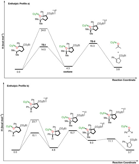 - Ludwig, J.R.; Phan, S.; McAtee, C.C.; Zimmerman, P.M.; Devery, J.J., III; Schindler, C.S. Mechanistic Investigations of the Iron(III)-Catalyzed Carbonyl-Olefin Metathesis Reaction. J. Am. Chem. Soc. 2017, 139, 10832–10842. [Google Scholar] [CrossRef] [PubMed]
