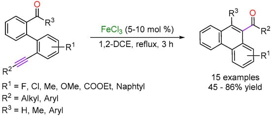 - Bera, K.; Sarkar, S.; Jalal, S.; Jana, U. Synthesis of substituted phenanthrene by iron(III)-catalyzed intramolecular alkyne-carbonyl metathesis. J. Org. Chem. 2012, 77, 8780–8786. [Google Scholar] [CrossRef]