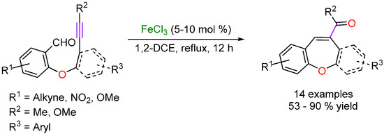 - Bera, K.; Jalal, S.; Sarkar, S.; Jana, U. FeCl3-catalyzed synthesis of functionally diverse dibenzo[b,f]oxepines and benzo[b]oxepines via alkyne-aldehyde metathesis. Org. Biomol. Chem. 2014, 12, 57–61. [Google Scholar] [CrossRef] [PubMed]