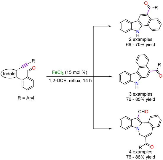 FeCl3-catalyzed reaction towards benzocarbazoles and azepino[1,2-a]indoles.