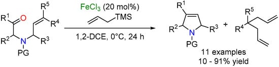 As the authors hypothesized that bulky benzoyl and phenyl groups play a key role in the formation of the transition structure, mainly these were chosen for R1, R2 and R3. Extending the previous scope, modification of the conditions was also employed to provide five-membered nitrogen heterocycles in poor to excellent yields. The reaction temperature was lowered to 0° and allyltrimethylsilane was used as an additive (5 eq.), as the reaction did not proceed by only using iron(III)chloride (Scheme 14).