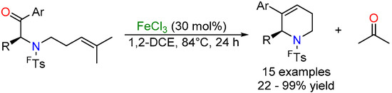 The first catalytic carbonyl–olefin metathesis approach employing the Lewis acid FeCl3 as an environmentally friendly catalyst in a ring-closing reaction was published by the research group of Schindler, which presented a wide scope of almost 50 examples with moderate-to-excellent yields under mild reaction conditions (Scheme 12): [40]