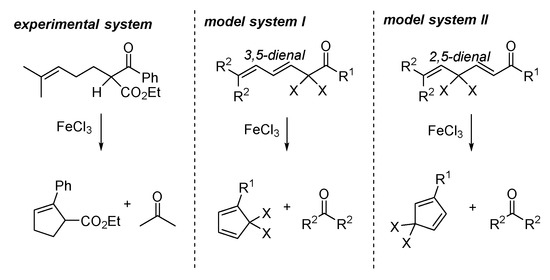 - Chen, D.; Zhuang, D.; Zhao, Y.; Xie, Q.; Zhu, J. Reaction mechanisms of iron(iii) catalyzed carbonyl–olefin metatheses in 2,5- and 3,5-hexadienals: Significant substituent and aromaticity effects. Org. Chem. Front. 2019, 6, 3917–3924. [Google Scholar] [CrossRef]